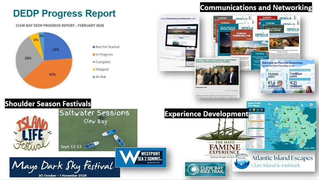 Members of the Clew Bay Tourism Network met on February 26th at Knockranny Park Hotel to review progress across the Clew Bay Destination and Experience Development Plan (DEDP) and discuss priorities for the year ahead. Encouragingly, over 60% of DEDP actions are now either complete or underway, with updates provided on eight key catalyst projects.